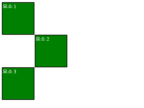 지정한 위치 값(left: 105px)만큼 떨어져서 배치된 것을 위의 예제 실행 결과를 통해서 확인할 수 있다.