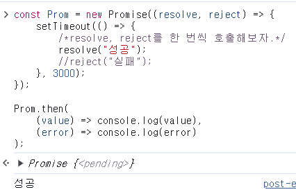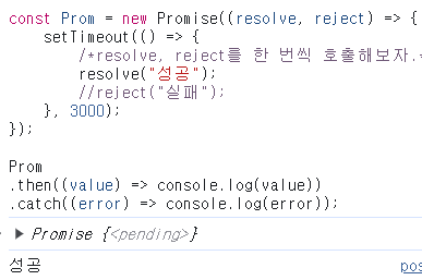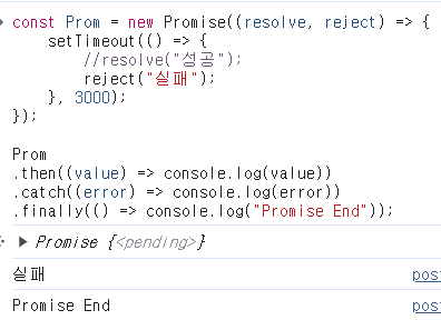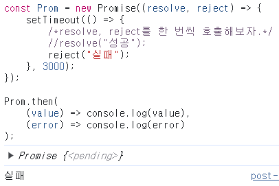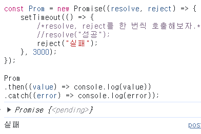 작업에 실패한 경우에는 '.catch()'의 Callback이 실행됐다. (문자열 "실패" 출력)