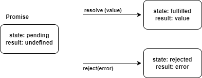 resolve(value) 혹은 reject(error)를 호출하는데, 호출한 함수에 따라 내부 프로퍼티가 바뀐다.