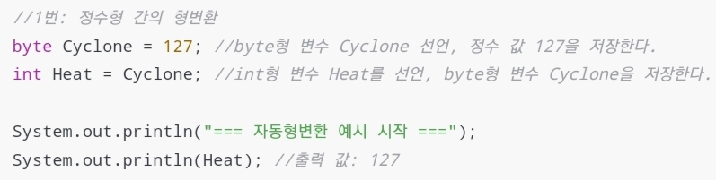 int Heat = Cyclone; //int형 변수 Heat를 선언, byte형 변수 Cyclone을 저장한다.