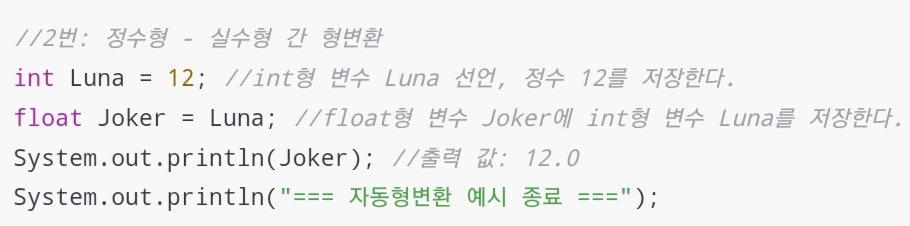 int형 변수 Luna가 float형으로 자동형변환되어, float형 변수 Joker에 저장된다.