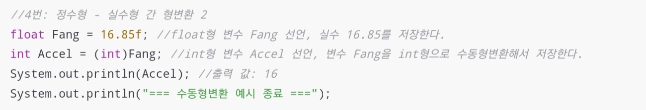 int Accel = (int)Fang; //int형 변수 Accel 선언, 변수 Fang을 int형으로 수동형변환해서 저장한다.