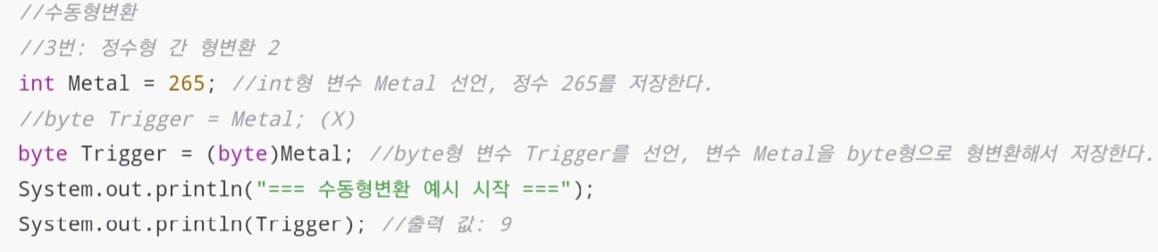 //다만 수동형변환은 데이터 크기가 큰 타입에서 작은 타입으로 강제 형변환을 하기 때문에