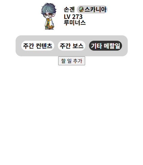 Nexon Open API 통해 메이플스토리 내, 해당 닉네임과 동일한 닉네임의 캐릭터 정보를 받아오고데이터를 성공적으로 받아왔다면, 아래 이미지처럼 To Do List 페이지로 이동한다.