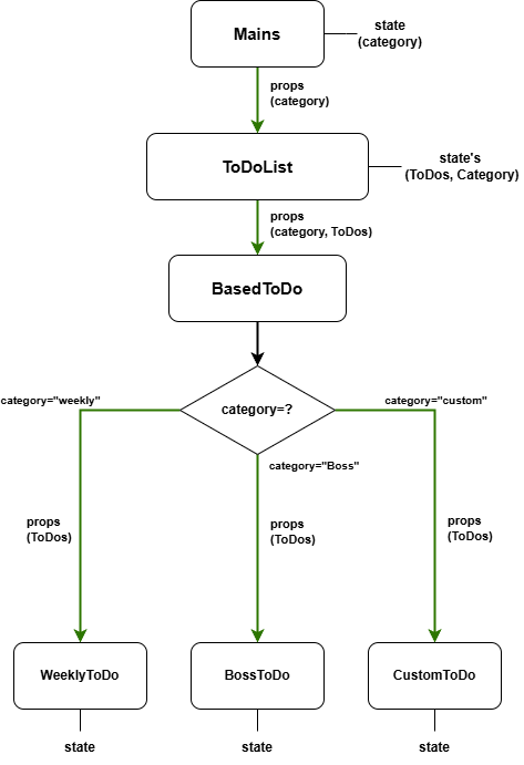 - category의 값에 따라 WeeklyToDo/BossToDo/CustomToDo 중 하나를 랜더링