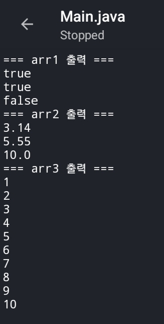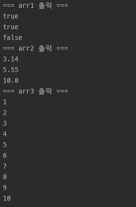 arr3에 1부터 10까지 값을 순차적으로 저장하기 때문에, for 반복문을 활용해서 값을 저장 및 출력이 가능하다.