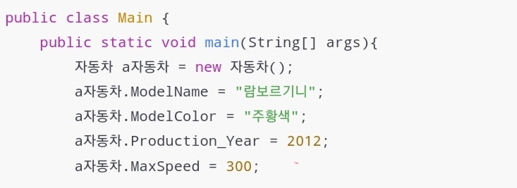 참조 변수 a자동차를 통해서 자동차 객체의 변수 값을 위와 같이 수정할 수 있다.