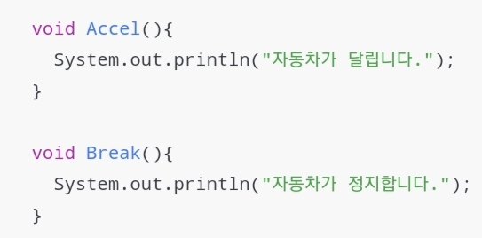 자바에서는 자동차, 객체의 기능이나 행동에 속하는 것들을 '메소드(method)'라고 한다.