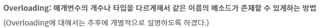 - 매개변수의 개수, 타입을 다르게 해서 같은 이름의 메서드가 존재할 수 있게 하는 기법