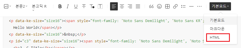 해당 메뉴에서 HTML을 클릭해서 글쓰기 모드를 HTML로 바꾸자. 그러면 아래와 같은 화면이 나올 것이다.