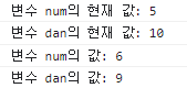 변수 num과 dan에 저장된 값을 먼저 출력하고, 이후에 값을 1씩 증가 및 감소시킨다.