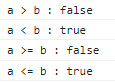 1 2 3 4 5 6 7 8 9 10 11 | //비교 연산자 예제 let a = 5; let b = 7; console.log(`a > b : ${a > b}`); console.log(`a < b : ${a < b}`); console.log(`a >= b : ${a >= b}`); console.log(`a <= b : ${a <= b}`); | cs |