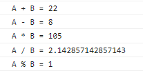 1 2 3 4 5 6 7 8 9 10 | //산술 연산자 예제 let A = 15; let B = 7; console.log(`A + B = ${A + B}`); console.log(`A - B = ${A - B}`); console.log(`A * B = ${A * B}`); console.log(`A / B = ${A / B}`); console.log(`A % B = ${A % B}`); | cs |
