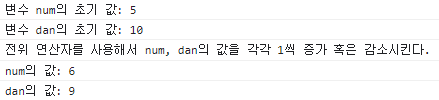 변수 num과 dan에 저장된 값이 각각 1 씩 증가 및 감소된 후에 출력된 것을