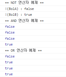 | ! (NOT) | 피 연산자의 값이 true면 false를, false이면 true를 반환하는 연산자 | ||||